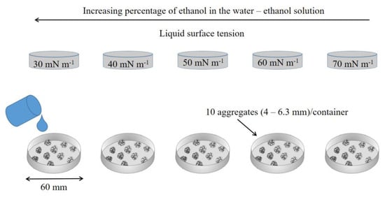 Aggregate stability was determined using clod field samples, with manual crushing and sieving to a size between 4.0 and 6.3 mm. Stability determination was performed using the procedure developed by Goebel et al. [], using the immersion of aggregates in ethanol–water solution with different surface tensions. The ethanol–water solutions were 47.0%, 19.9%, 10.2%, 4.7%, and 0.9% (by mass), that is, surface tensions of 30, 40, 50, 60, and 70 mN m−1. The surface tensions of the ethanol–water solutions were determined using an electronic scale with the Du Noüy ring method, cited in Goebel et al. [].