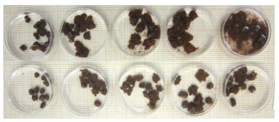Ten aggregates from each soil were selected and placed in Petri dishes with a diameter of 60 mm. Simultaneously, 15 mL of each solution was added according to the scheme in Figure 2. The changes in the structure of the aggregates were analyzed in photographic images at times of 0.5, 1, 2, 5, 10, 20, 30, and 60 min of immersion, obtained with a digital camera (Figure 3). After 30 min of immersion, the number of intact aggregates was counted on each plate (C = 1 to 5), and the percentage of aggregates (n = 50) was calculated. The stability of aggregates was determined by the aggregate stability (AS) index: