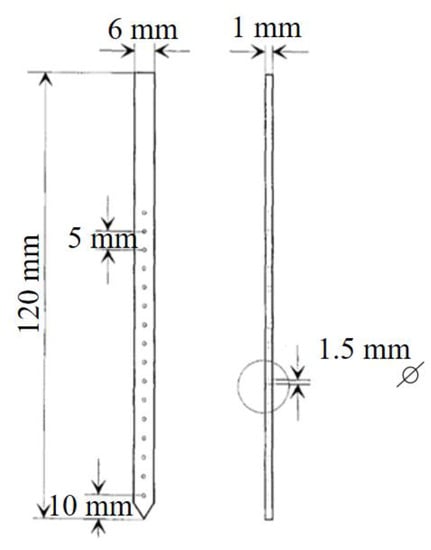 To determine the feeding activity of soil organisms, the Bait blade method proposed by Törne [] was used. The method consists of a set of polyvinyl chloride (PVC) blades, 120 mm long, 6 mm wide, and 1 mm thick, with 16 holes 2 mm in diameter, spaced 5 mm apart; see Figure 4 []. As a substrate, a moistened mixture of powdered cellulose (70%), wheat flour (27%), and activated charcoal (3%) was used [], with which the holes were manually filled. The method was chosen due to its low cost, simplicity, efficiency, and its ability to not cause disturbances in the soil and landscape [,].