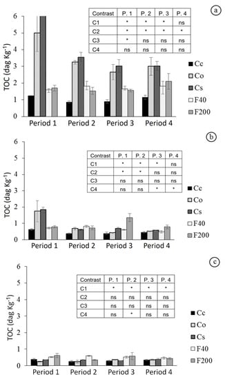 Total organic carbon (TOC, dag kg−1) in layers 0–0.05 m (a), 0.05–0.20 m (b), and 0.20–0.40 m (c) at four sampling periods of each treatment: Cc = conventional citrus; Cs = agroforestry citrus; Co = organic citrus; F40 = forest with 40 years of regeneration; and F200 = forest with 200 years of regeneration. * Orthogonal contrast significant at 5%; ns = not significant; C1 = Forests vs. Citrus; C2 = Co + Cs vs. Cc; C3 = Cs vs. Co; and C4 = F200 vs. F40. Period 1—Spring 2014; 2—Summer 2015; 3—Winter/Spring 2015, and 4—Spring/Summer 2015.
