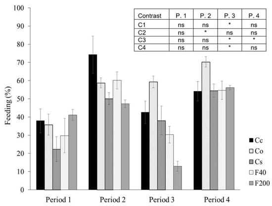 Average feeding activity in each period, in the standard 7.5 cm layer, in Cc (conventional citrus), Cs (agroforestry citrus), Co (organic citrus), F40 (forest with 40 years of regeneration), and F200 (forest with 200 years of regeneration). * Orthogonal contrast significant at 5%; ns = not significant; C1 = Forests vs. Citrus; C2 = Co + Cs vs. Cc; C3 = Cs vs. Co; and C4 = F200 vs. F40. Period 1—Spring 2014; 2—Summer 2015; 3—Winter/Spring 2015; and 4—Spring/Summer 2015. Vertical bar for each mean is standard error.