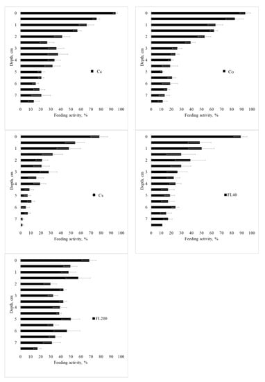 In the first period (Spring 2014, Figure 7), a similar behavior can be observed between the sites of citrus cultivation and the F40 forest site, with more intense consumption close to the surface and less intense at greater depth. A striking fact is the behavior of the F200 forest, in periods 1, 2, and 4, with a homogeneous consumption along the blade, which represents an active behavior of the fauna in the soil with biological stability. In the second period (Summer 2015, Figure A4), there was the highest general consumption among the studied periods. The Cc site had high consumption throughout the entire follow-up, while the Co, Cs, and F40 sites showed a consumption gradient. Regarding period 3 (Winter/Spring 2015, Figure A5), the feeding behavior was similar between the forest and agroforestry sites, with a gradient of high activity on the surface and little consumption at depth. Period 4 (Spring/Summer 2015, Figure A6) was similar to period 2 (Summer 2015).