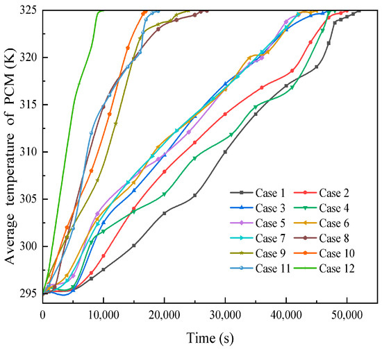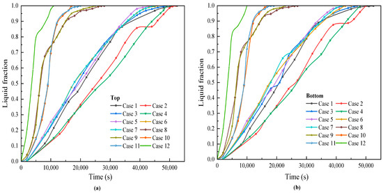 - In the range of tube length H between 1.6 m and 0.2 m, and PCM thickness D between 19.7 mm and 49 mm, an increase in tube length H results in a corresponding decrease in PCM thickness D. Consequently, this promotes more robust natural convection within the PCM. As a result, the melting time of PCM increases in tandem with the tube length H, demonstrating a positive correlation. Moreover, under the bottom-injection condition, the melting time of PCM is generally faster than that of the top injection.