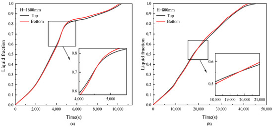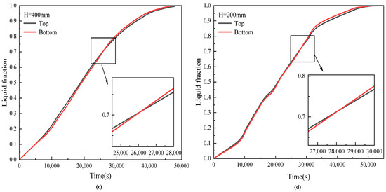 - Regardless of whether the heat-transfer fluid is injected at the top or bottom, when the tube length H exceeds 800 mm, the melting efficiency of the PCM undergoes a significant change, leading to a reduction in melting time of nearly 15,000 s.