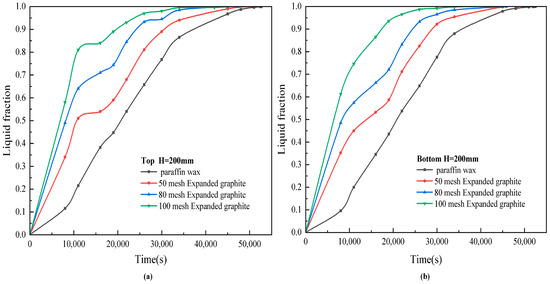 - For instance, when considering H = 200 mm and top injection, the three types of composite materials containing 10% expanded graphite with different mesh numbers can save 5.3%, 10.2%, and 14.3% of the melting time, respectively, compared to pure paraffin wax. On the other hand, in the case of bottom injection, these three composite materials save 7.7%, 12.5%, and 17.2% of the melting time, respectively, further emphasizing the more significant effect of improving the melting time with bottom injection.