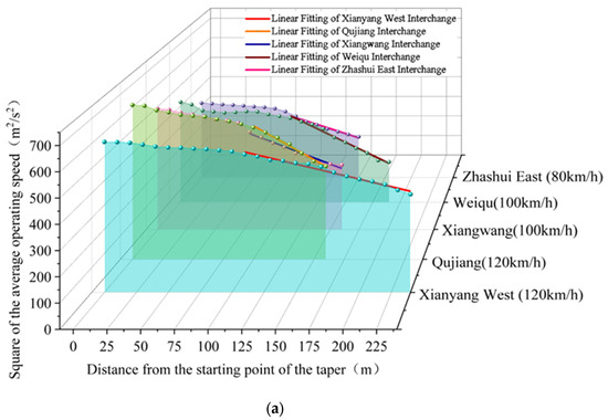 The goodness-of-fit of the five interchanges measured is greater than 0.95, close to 1. The fitting effect is good, and it is considered that the square of the vehicle operating speed on the deceleration lane has a linear relationship with the driving distance. This implies the uniform deceleration pattern.