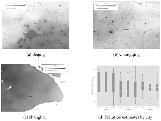 As discussed earlier, monitor-level PM data are not available at the beginning of our study period; however, using monitor data from 2015 and 2016, we find a correlation of remote-sensing estimates and monitor-level averages for monitored sites to be about 0.7, without information of the composition of air-bone particulates. The mean pollution level across monitored locations is 53.4 and 49.02 g/m for 2015 and 2016, respectively, while the mean of the remote-sensing estimates is slightly lower, at 52.7 and 46.9 g/m, respectively. This slight difference is expected as remote-sensing estimates tend to understate pollution at higher levels due to saturation [29]. In addition to better temporal coverage, remote-sensing pollution estimates offer several advantages over monitor-based readings for our setting, as the spatial coverage of surveyed households would be incomplete for the monitoring data. We illustrate this in Figure 1, which presents the monitor locations and heat maps of satellite-derived pollution estimates (Figure 1a–c), and the distributions of pollution levels (Figure 1d) for Beijing, Chongqing and Shanghai, three of the largest cities in China. In all three cities, we observe sparse monitor coverage and a large within-city variation of pollution concentrations in both monitored and unmonitored areas.