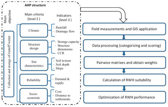 AHP structure and methodology for assessing rainwater harvesting (RWH) sites in arid and semi-arid regions. CCR: catchment to cropping area ratio. Reprinted from [36].