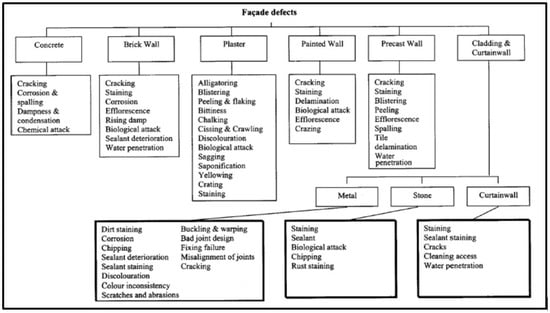 Common defects in different types of facades. Reproduced from [37] with permission from Journal of Architectural Engineering; ASCE library, 2004.