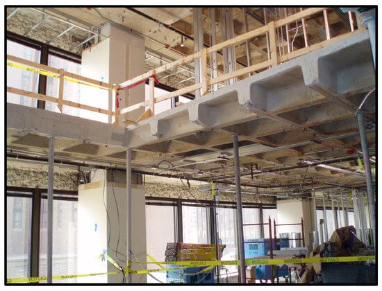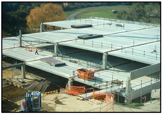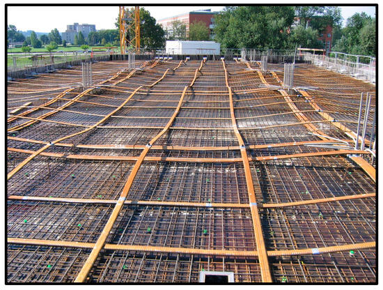 Figure 5 shows the post-tension slab system, which is a mixture of conventional slab reinforcement and further protruding high-strength steel tendons which are subjected to tension after the concrete has set. This hybridization helps accomplish the formation of a much thinner slab with a longer lifespan and removes the need for columns [45,46,47]. Post-tensioned concrete is tougher and more flexible than conventional steel-reinforced concrete. Post-tensioning helps lessen cracking from shrinkage as the concrete is held together as it dries. However, there are disadvantages, e.g., the numerous tendons and wires arranged inside the post-tension slab can rust. Because of the intricacy of the work required, poor workmanship can lead to catastrophes.
