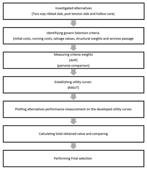 The criteria used to develop the AHP–MAUT-based framework were initial cost, running costs, salvage value, structural weight, and the possibility of utilities passage. This was achieved by using the AHP to determine the weights of the different criteria, while the preference utility values were determined using the MAUT. This research complements the existing body of knowledge by showing that the most important criterion is utilities passage, followed by structural weight, initial cost, salvage value, and running costs.