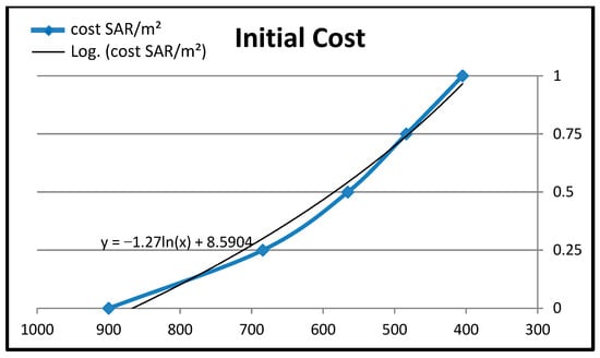 The correlation between the utility score and initial cost (SAR/m2) is shown in Figure 8. There is a decreasing tendency in initial cost as the utility score rises from 0 to 1. This suggests that the two variables are inversely related. Accordingly, choices with higher utility scores offer advantages that outweigh their initial costs. Additionally, by contrasting the values, it can be shown that the incremental differences between each succeeding initial cost value get smaller as the utility score rises. This suggests that as the utility score gets closer to its maximum value, the initial cost gets smaller.