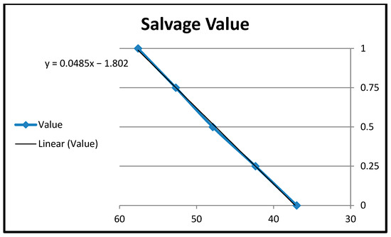 The relationship between the utility score and salvage value can be seen in Figure 9. As the utility score rises from 0 to 1, salvage value shows an upward trend. This suggests that the two variables have a positive association. Furthermore, by contrasting the alternatives, we can demonstrate that as the utility score rises, the incremental increases between each succeeding salvage value get lower. As an illustration, the difference between the salvage values of options 1 and 2 is 5.35, whereas the difference between the salvage values of options 3 and 4 is only 4.9. This suggests that as the utility score nears its maximum value, the incremental rises in salvage value decrease.