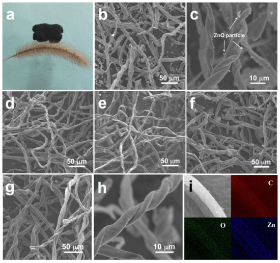(a) Photograph of ZnO/CFA-600 on a Setaria glauca; SEM images of (b,c) ZnO/CFA-600, (d) ZnO/CFA-500, (e) ZnO/CFA-700, (f) ZnO/CFA-800, and (g,h) CFA-600; (i) EDS elemental mapping of ZnO/CFA-600.