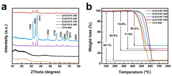 (a) XRD patterns and (b) TG analysis in air of various ZnO/CFA-t products.