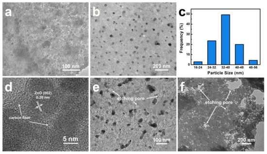 The detailed structural variation of four 3D ZnO/CFA-t products was explored by their TEM images. In Figure 3a, many tiny particles are hazily seen on the ZnO/CFA-500, suggesting the preliminary formation of ZnO crystals. When the calcination temperature was increased to 600 °C, the initial ZnO particles grew to nanoscale and were evenly anchored on the carbon fibers, as shown in the TEM image of the ZnO/CFA-600 (Figure 3b). The statistical result (Figure 3c) shows that these ZnO particles have a uniform size in the narrow range of 16–56 nm. The corresponding HRTEM image (Figure 3d) reveals a distinct lattice fringe with a distance of 0.26 nm, attributed to ZnO (002). This result indicates the good crystallinity of ZnO in the ZnO/CFA-600, which is consistent with the XRD analysis above. However, the excessive temperature will destroy the high dispersity and uniformity of supported ZnO nanoparticles, as witnessed on the TEM image of the ZnO/CFA-700 (Figure 3e). Meanwhile, some nanosized pores are also formed on the carbon matrix due to the high-temperature etch of ZnO, as confirmed by the XRD and TG analyses above. When the calcination temperature reaches as high as 800 °C, the deep etch of ZnO produces a large number of pores on the surface of the ZnO/CFA-800 (Figure 3f), while no ZnO particle is clearly seen.