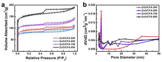 (a) N2 adsorption–desorption isotherms and (b) pore size distributions of various ZnO/CFA-t products.