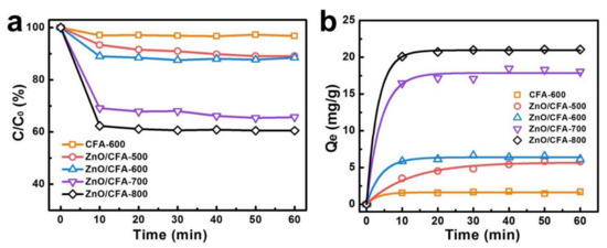 In the present study, tetracycline (TC) was chosen to evaluate the adsorption capacity and photocatalytic activity of the as-obtained ZnO/CFA-t products. As shown in Figure 5a, both the CFA-600 and four ZnO/CFA photocatalysts are found to exhibit a rapid adsorption capacity for TC, all of which could reach saturated adsorption within 10 min. From the adsorption isotherms (Figure 5b), it is illustrated that the adsorption capacity of CFA-600 is improved after hybridization with ZnO nanoparticles. As for the 3D ZnO/CFA samples, their saturated adsorption capacities (Qe) gradually increase with the calcination temperature, resulting from the high-temperature etch of ZnO and the enlargement of surface area. As summarized in Table 1, the Qe of the CFA-600, ZnO/CFA-500, ZnO/CFA-600, ZnO/CFA-700, and ZnO/CFA-800 was calculated to be 1.56, 3.53, 5.87, 16.46, and 20.09 mg/g, respectively.