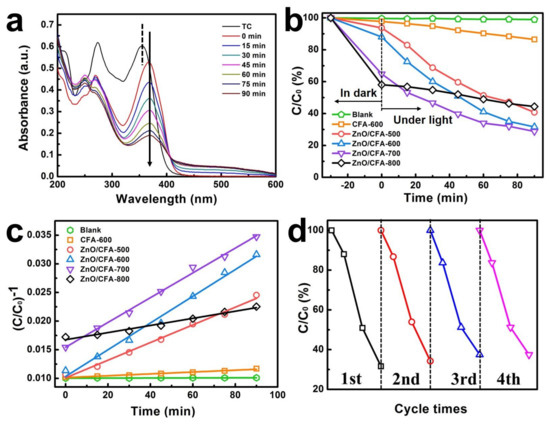 (a) Time-dependent absorbance of TC solution with ZnO/CFA-600 under UV light irradiation; (b) Photocatalytic degradation of TC with no catalyst, CFA-600, and various ZnO/CFA-t products, and (c) their corresponding kinetic plots; (d) Cycling performance of ZnO/CFA-600 for photodegradation of TC.