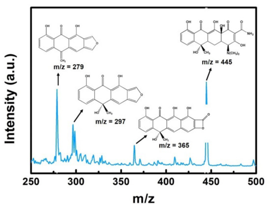 Furthermore, possible photodegraded products are analyzed by HPLC-MS spectrometry, as shown in Figure 7. Besides the TC molecule with a m/z of 445, several strong peaks at 365, 297, and 279 come from some intermediate organics with small molecular weights, the possible structural formulas of which are also shown in Figure 7. Although the TC pollution is not completely mineralized, its stable structure could be destroyed by photocatalysis to greatly decrease its toxicity.