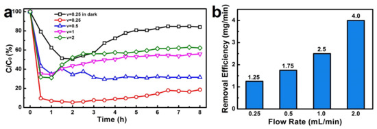(a) Time-dependent removal ratio of TC over 3D ZnO/CFA-600 sample with different flow rates in a dynamic system, and (b) corresponding TC removal efficiency.
