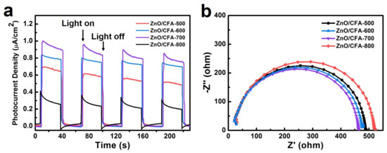 To figure out the photoelectronic property of ZnO/CFA products, photocurrent measurements were performed for four UV-light-on/off cycles in a 0.1 M Na2SO4 solution, as shown in Figure 9a. ZnO/CFA-600 and ZnO/CFA-700 exhibit higher photocurrent densities in comparison to the other two photocatalysts during UV light irradiation. In terms of the XRD and TG results, it is certified that the ZnO/CFA-600 and ZnO/CFA-700 both have high ZnO loading and good ZnO crystallinity, thus explaining their superior photo-to-electron transfer efficiency. However, the photocurrent density of the ZnO/CFA-700 is slightly higher than that of the ZnO/CFA-600, resulting from the fact that highly graphitized carbon fibers will be produced at 700 °C or above, which is more favorable to the fast transfer of surface electrons. Consequently, the graphitized structure of carbon fibers will be important to effectively separate the photogenerated electron/hole pairs, further enhancing the photocatalytic performance of the ZnO/CFA aerogel.