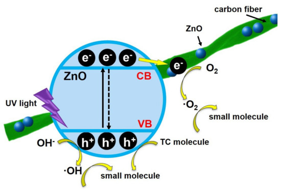 Based on the experimental and analyzed results, the photocatalytic mechanism of the ZnO/CFA photocatalysts is explored in the present work. As shown in Scheme 1, under UV light irradiation, ZnO nanoparticles could be excited to allow for the separation of photogenerated electron/hole (e−/h+) pairs. In an aqueous solution, e− will react with dissolved O2 to produce ·O2, while h+ combines with OH− to form ·OH radicals. As a result, those highly active species, i.e., ·OH, ·O2, and h+, could simultaneously decompose TC to yield small organic molecules [5]. In the ZnO/CFA photocatalyst, ZnO nanoparticles play the role of the real reactive center, and their loading and dispersion will greatly affect the overall photocatalytic performance.
