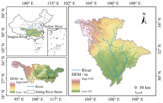 The location of the Jialing River Basin is shown in Figure 1. It is located in the central and western regions of China, spanning Shaanxi, Sichuan, Gansu, and Chongqing. Its geographical location is 102°35′36″~109°01′08″ E and 29°17′30″~34°28′11″ N. The Jialing River originates from Daiwang Mountain, Fengxian County, north of the Qinling Mountains, Shaanxi Province. The tributary has the largest drainage area in the Yangtze River system. It flows into the main stream of the Yangtze River at the wharf in Chongqing, with a total length of approximately 1120 km. The overall water system is fan shaped [32]. Its main tributaries are the Fujiang River and Qujiang River, with a total drainage area of 161,900 km2. It has complex geological, geomorphic, and climatic conditions. Due to the loose soil quality in the upstream loess area, the purple red shale in the middle and downstream is prone to weathering, resulting in severe soil erosion. The southern part is Sichuan Basin, one of the four Great Basins in China. The basin bottom is low, and the northern part is the western section of the Qinling Mountains. The mountains are all above 1500 m above sea level. The terrain is steep and there are many canyons. The study area is far from the sea and located at a low latitude, with a subtropical monsoon climate [33]. The annual rainfall distribution is uneven, with more rainfall in summer and autumn and less rainfall in winter and spring. The annual average temperature is approximately 10 °C, and the annual evaporation is 800~900 mm [34].