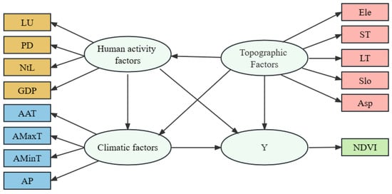 Conceptual structural equation model of NDVI in the Jialing River Basin. Ellipses represent potential variables. Squares with different colors represent the observable variables that constitute different potential variables. Arrows between latent and observable variables indicate correlations between them. Arrows between potential variables indicate causal relationships.