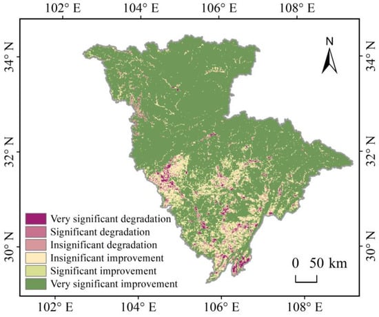 where ; ; and . is the test statistic and is the sign function. At the confidence interval of 0.05, it passes the significance test with confidence levels of 99% () and 95% (). Through grid superposition analysis of the NDVI change results and the M–K test results in the Jialing River Basin, the change type was divided into six levels, as shown in Table 1.