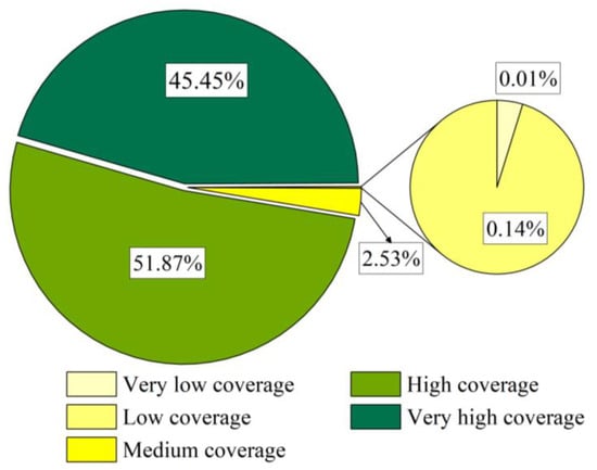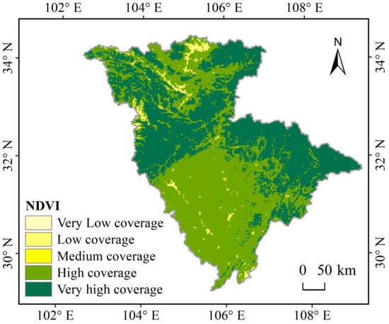 Based on the vegetation data from 2000 to 2020, combined with the actual situation of the Jialing River Basin and the previous classification standards, the vegetation coverage was divided into five categories by the mean NDVI value at equal intervals: extremely low coverage (0–20%), low coverage (20–40%), medium coverage (40–60%), high coverage (60–80%), and extremely high coverage (80–100%). As shown in Figure 5 and Figure 6, 45.45% of the Jialing River Basin was classified as a very high vegetation coverage area, most of which was located in the northwest and east of the basin, including the Sichuan Basin, southern Shaanxi, and Wushan region. The high vegetation coverage area accounted for 51.87%, making it the main vegetation coverage type, and most sites were located in the south of the basin and distributed in a continuous strip. The medium vegetation coverage area accounted for 2.53%, and it was concentrated in the north of the basin and distributed in a relatively scattered and continuous strip. The areas of low and very low vegetation coverage accounted for only 0.15%, and these areas were scattered in the northern part of the basin, mostly including urban construction land and unused land.