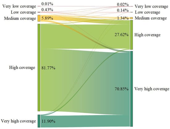 As shown in Figure 7, during 2000–2020, the area with high vegetation coverage increased significantly, mainly due to the transformation from lower to higher vegetation coverage. Due to the increase in construction land area, low vegetation coverage showed an increasing trend. From 2000 to 2020, the areas of very low and very high vegetation coverage in the Jialing River Basin gradually increased, while the areas of low, medium, and high vegetation coverage gradually decreased. The original area with very low vegetation coverage remained unchanged, and the proportion of new area was 0.05%. Low vegetation coverage was mainly converted to high vegetation coverage, and the percentage of conversion area was 0.27%, with 0.03% remaining as the initial attribute. Medium vegetation coverage was mainly transformed into high (3.73%) and very high (1.45%) coverage, with 0.63% remaining as the initial attribute. After transformation, the area of very high coverage increased by 58.95%. According to the transfer matrix analysis, it mainly came from two categories: high coverage (58.41%) and medium coverage (1.45%). The area of high vegetation coverage decreased by 54.15%, which was mainly converted into two categories: extremely high coverage (58.41%) and medium coverage (0.59%).