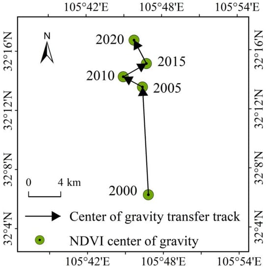The NDVI center of gravity can effectively display the uneven and biased spatial distribution of the NDVI within the study area. The period from 2000 to 2020 was divided into four periods, each of which was 5 years, and the average NDVI of the different time intervals was analyzed. Figure 8 shows that the NDVI center of gravity showed a northwards migration trend over the past 20 years, with a longitude of 105°44′56″–105°46′52″ and latitude of 32°6′13″–32°16′41″. The shift in focus from 2000 to 2005 was the largest, followed by a decrease in the magnitude of the shift. These results indicated that growth of the NDVI in the north was better than that in the south during the study period.