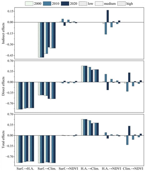 The driving effects of various factors on different levels of the NDVI are shown in Figure 10. Different latent and observable variables had different effects on different levels of the NDVI. The impact of surface factors on the NDVI was mainly indirect. Among indirect effects, the surface had a positive effect on low and medium NDVI and a negative effect on areas with high vegetation coverage. The impact of human activities on the NDVI was mainly direct. Among direct effects, human activity factors had a negative effect on high NDVI and a positive effect on the NDVI in areas with low and medium vegetation coverage. The indirect effect was the opposite of the direct effect. The impact of climate factors on the NDVI was direct. Among direct effects, the latent and observable variables had a negative effect on the NDVI in low and medium vegetation coverage areas and a positive effect on high NDVI areas. The impact on medium and high NDVI was relatively strong. In summary, the driving mechanisms of low and medium NDVI were relatively similar but tended to be opposite to those of high NDVI. Medium and high NDVI values were more influenced by observable variables.