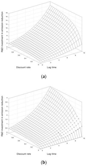 The impact of lag time and discount rate on R&D investment in emission reduction. (a) The impact of lag time and discount rate on R&D investment in emission reduction under centralized decision-making. (b) The impact of lag time and discount rate on R&D investment in emission reduction under decentralized decision-making.