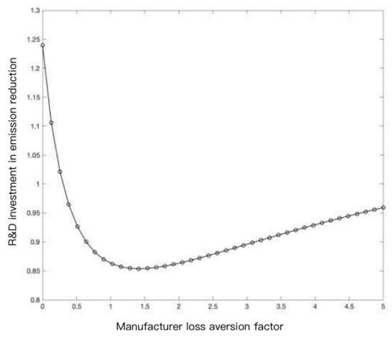 Under the decentralized decision based on the manufacturer’s loss-aversion preference, when the manufacturer’s loss-aversion factor is less than , the investment in emission reduction increases as the loss-aversion factor increases. When the manufacturer’s loss-aversion factor is greater than , the investment in emission reduction decreases as the loss-aversion factor increases.