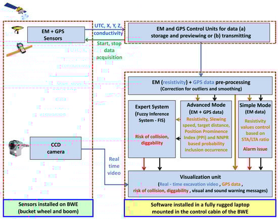 Block diagram of the proposed automatic unmineable inclusions detection and collision prevention system. Colored arrows indicate data or commands transfer, while the black ones are the two possible processing flow paths (Simple or Advanced Mode). Blue and green colors indicate, respectively, original data or commands, while orange and red colors indicate processed data/intermediate results and final results, respectively. GPS preprocessed data are transferred directly to visualization unit in case of the Simple Mode activation.