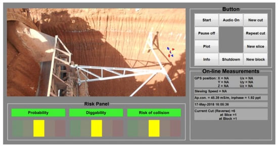 A graphical user interface (visualization unit) provides selected information to the operator of the BWE in a simple and comprehensive way (Figure 3). This unit allows the BWE operator to control the proposed system and provides basic information, such as: (a) the real-time visualization of the excavated bench face from the CCD camera, (b) visual color levels of the probability, the risk of collision (with sound warnings in the cases of high values) and the diggability, as well as (c) real-time measurements (i.e., bucket wheel position and speed, conductivity or resistivity measurements, etc.) depending on the active processing mode (simple or advanced).