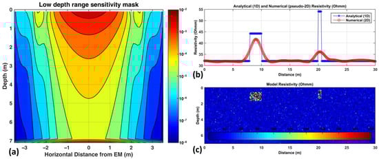 (a) 2D normalized cumulative sensitivity for the low depth range, with a coil separation of 1.89 m and maximum depth penetration of 7 m. The instrument is positioned at a horizontal distance of x = 0 m, which is the location with the highest sensitivity values (plotted in logarithmic scale). (b) Synthetic apparent resistivity values over (c) a 30 m × 7 m model with grid size 0.1 m. Two higher resistivity (5 mS/m or 200 Ωm) bodies of dimensions (X, Z) 2 × 1 and 0.5 × 1 are buried at depths (top of bodies) 0.6 and 0.2 m from the surface within a homogeneous lower resistivity (31.25 mS/m or 32 Ωm) half space. Random noise with zero mean and standard deviation of 20% of the half-space conductivity was added to model conductivity values.