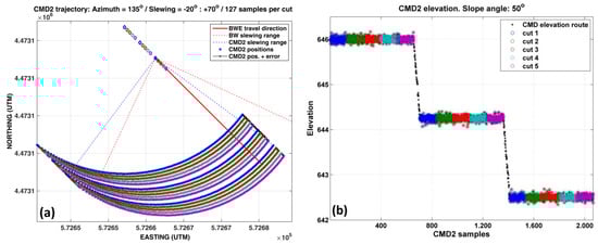 EM sensor (CMD2) trajectories in X-Y coordinates (UTM) (a) and elevations (b) during the excavation of a block by terrace cutting. The different colors of CMD2 trajectories correspond to the different cuts.