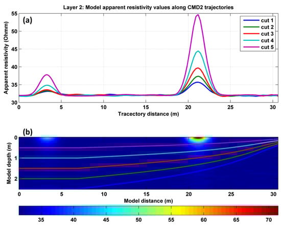 Figure 4a illustrates the cumulative sensitivity weighting factor for the CMD2 instrument utilized in this study, considering a coil spacing of 1.89 m, low depth range mode (horizontal coil axes), and a maximum depth of EM signal penetration equal to 7 m. Additionally, Figure 4b displays the synthetic apparent resistivity (ρa = 1/σa) profiles corresponding to both 1D and 2D approaches. These profiles depict a model comprising a conductive half-space, which includes two non-conductive bodies. Normally distributed pseudorandom numbers with zero mean and standard deviation of 20% of the half space conductivity were created using the “randn” MATLAB function and were added to model conductivity values.