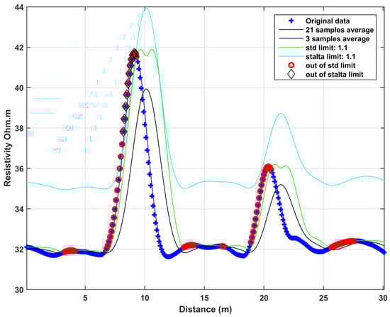 An example of SMHRD algorithm application on the synthetic resistivity values deduced from the model presented in Figure 4b. The multiplication factor limits for the standard deviation (STD) and STA/LTA ratio are both set to 1.1. An alarm is issued from 8.2 to 9.2 m where both std (red circles) and STA/LTA (rhombus) limits are violated.