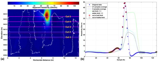 To further analyze the data, separate datasets were extracted from five resistivity profiles spaced 0.5 m apart, representing successive cuts made by the bucket wheel excavator (cut 1–5). Figure 8b presents an example of the SMHRD application specifically for the 4th cut based on the aforementioned experimental data. This cut is considered to be the one immediately preceding the bucket wheel’s encounter with the boulder (which occurs at the 7 m along the fifth cut). In this figure, warning alerts are indicated in regions where the STA value exceeds both the standard deviation and STA/LTA predefined limits, coinciding with a sharp increase in resistivity values.