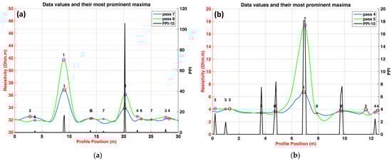 Application of PPI algorithm on (a) the synthetic data of model shown in Figure 4b and (b) the real data shown in Figure 8. The real apparent resistivity values (blue and green curves) correspond to the profiles from cut 2 and 3, respectively, while the PPI (black curve), to the third profile for NLM is equal to 10. The numbers next to circles or squares correspond to the rank of the identified local maxima.