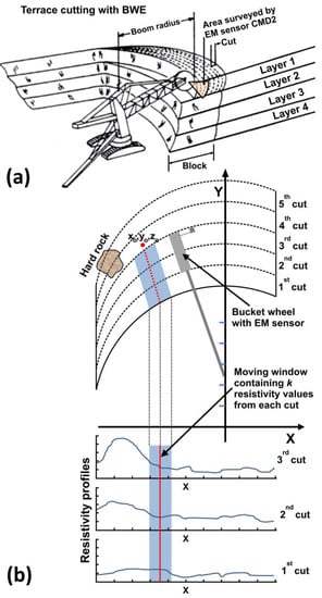 (a) The process of terrace cutting performed by the BWE. (b) The sequential resistivity profiles obtained during three successive terrace cuttings. The diagram further demonstrates the implementation of a moving window to analyze localized variations in the resistivity profiles as the bucket wheel approaches the hard rock formation.