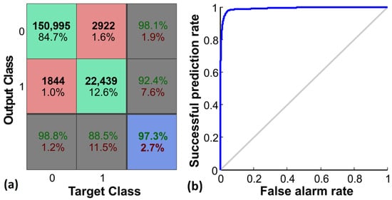 (a) The confusion matrices presenting the numbers and percentages of accurate and false predictions for all the data. Class 0 represents the non-existence of a hard rock formation, while Class 1 signifies the presence of a hard rock formation. (b) The Receiver-Operator Curve (ROC) demonstrating the relationship between the rate of successful predictions and the corresponding false alarm rate.