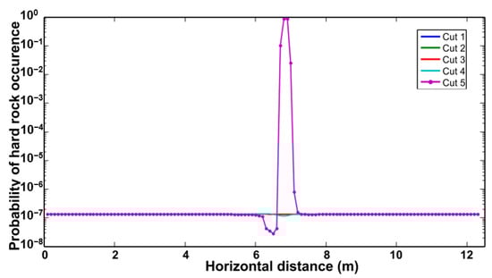Calculated probabilities along the real resistivity profiles indicated as cut 1–5 in Figure 8a. NNRPR predicted a probability of 0.92 for the occurrence of a hard rock formation around 7 m of the 5th cut.