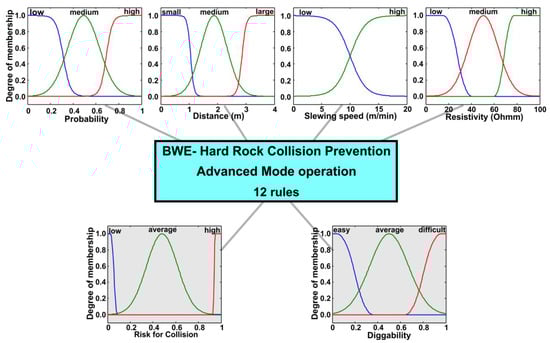 However, hard rock inclusion detection during BWE excavation is not enough. In order to retain a high level of the excavation productivity of soft materials containing hard inclusions, a decision-making system for optimum BWE collision prevention must be completed as well. Fuzzy inference systems (FIS) have been applied with success in mining [,]. Hence, a fuzzy inference system (FIS) is suggested to support the BWE operator in preventing collisions between the excavating buckets and the hard rock inclusions. FIS possesses the capability to handle imprecise or incomplete information and integrate it into the decision-making processes, relying on the expertise of an experienced professional [].