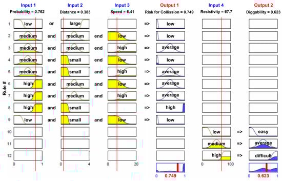 Overall, the FIS utilizes these inputs and outputs to analyze and make informed decisions based on the given mining conditions and expert insights. The structure of the FIS, consisting of four inputs, two outputs, and 12 rules, is shown in Figure 13. The rules of the FIS were derived from the collected knowledge and experience of mining engineers and BWE operators. These rules were optimized during the training of the FIS. Figure 14 provides a schematic depiction of the complete set of rules for the developed FIS. Except for rule 1 (with operator OR) and rules 10–12, which are solely influenced by the resistivity values, the fuzzy operator AND was applied to the other fuzzy antecedents. In the presented example (Figure 14), the probability is high (0.762), the distance is small (0.383 m), and the speed is low (6.41 m/min), resulting in an average to high risk of collision (0.749), while the resistivity is medium to high (67.7 Ωm) resulting in average diggability (0.623).