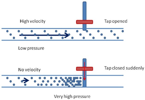 In the case that the fluid velocity in a pipe is high enough, its abrupt variation, consequent to the sudden closing of a waste valve, also determines a sudden increase in pressure (Figure 2), which, to a certain extent, can be compared to the well-known water hammer effect, since the water column is locally compressed by the closure of the valve. In fact, water flowing with a certain velocity has kinetic energy, and therefore a certain inertia, and the abrupt closure of the pipeline involves the transformation of this kinetic energy into pressure energy. This effect may turn into a loud noise similar to that of a hammer hitting a metal component.